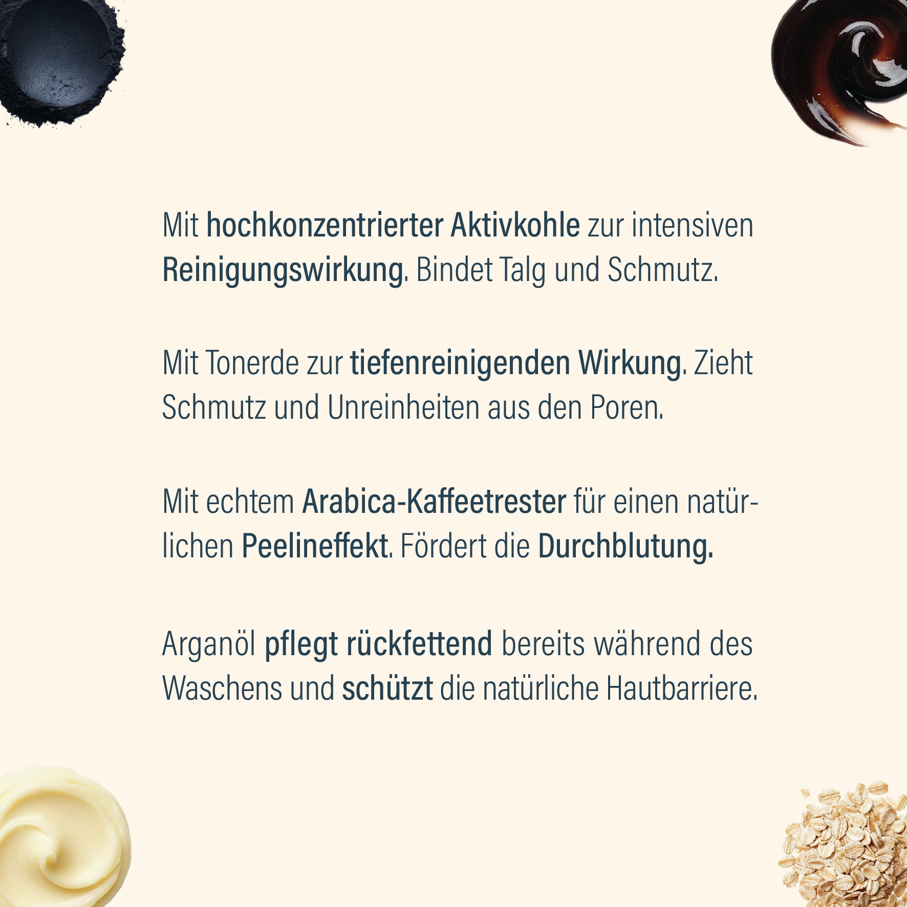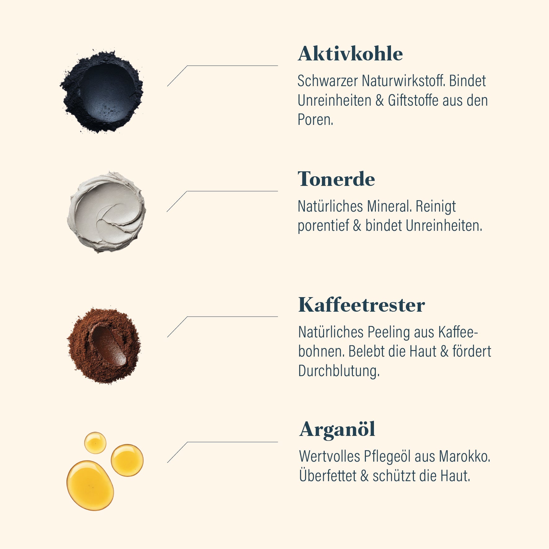 - Natürliche Inhaltsstoffe – Arganöl, Tonerde, Kaffee, Aktivkohle, Kiefernteer
